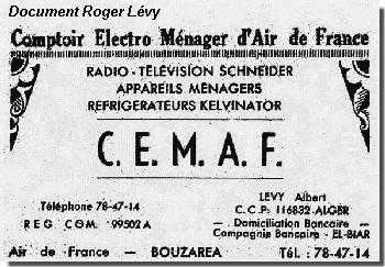 Ce magasin, bien que tout y fut correctement rangé, était un véritable capharnaüm, par la diversité des produits alimentaires (café Nizière "le roi des cafés", confitures Jeannette et Escla, pâtes alimentaires Ferrero ou Ricci, épices Spigol, boissons gazeuses, limonade ou "gazouze" et le légendaire Sélecto d'Hamoud Boualem, yaourts ou yoghourts Sainte-Marie, fabriqués à Bouzaréah et vendus, à la pièce, en pots de verres consignés) qui côtoyaient des articles des plus variés, allant des cigarettes Bastos, Globe ou Job, aux pelotes de laine et aux articles de mercerie. De part et d'autre de la petite entrée il y avait deux vitrines exiguës, domaine réservé de madame NADAL qui, au moment de la Fête des Mères, disposait élégamment, dans celle de droite, une multitude de menus objets destinés à nous inciter à y investir nos modestes économies : petits miroirs au cadre de plastique coloré, tubes de rouge Baiser ("le seul qui permet le baiser"), petits napperons brodés, vases miniatures en porcelaines, bonbonnières et les inévitables coffrets de flacons violets de parfum Soir de Paris de Bourjois (avec un "j" comme joie), le summum du luxe en raison de leur prix élevé. |